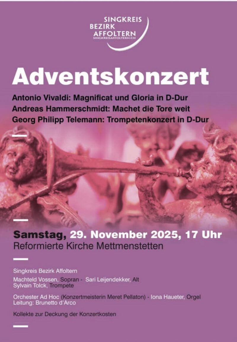 Unter Leitung von OVBL-Mitglied Brunetto d’Arco bietet der Singkreis Affoltern am Samstag, 29. November 2025, in der Reformierten Kirche von Mettmenstetten (Zürichstrasse 2, 8932 Mettmenstetten) ein festliches Adventskonzert dar.