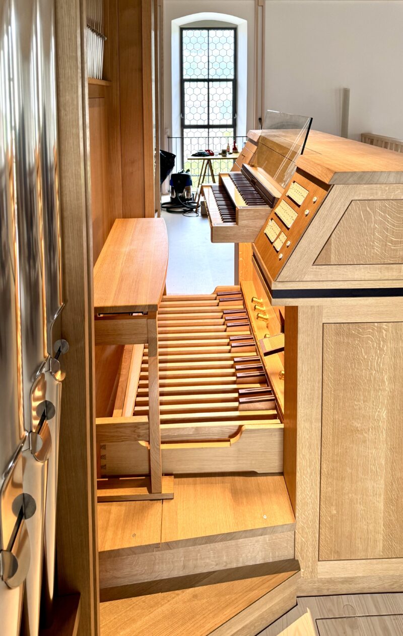Technisch kommt dem Instrument die Vielseitigkeit der in internationaler Orgelbautätigkeit erworbenen baulichen und musikalischen Erfahrungen zugute. Die mechanische Traktur dieser neuen romantischen Orgel hat einen exakten Ansatzpunkt und leichtgängige Verbindungen bis zu den relativ klein dimensionierten Ventilen. Es wurden sorgfältig ausgewählte Pfeifen von drei verschiedenen Firmen eingesetzt. Für einige grössere Pfeifen wurden zusätzlich pneumatische Einzelladen eingebaut, was die Luftzufuhr optimiert. Im Schwellwerk gibt es fünf, im Hauptwerk vier Achtfuss-Register. So mussten denn in der vorgegebenen Kubatur des Gehäuses relativ viele grosse Pfeifen untergebracht werden. Das Pedal verfügt über grosse Sonorität – u.a. dank der kunstvollen Transmission des offenen (!) Violon 16′ aus dem Schwellwerk ins Pedal. Per Fusspedal werden die Schwell-Jalousien, die beidseitig am Orgelgehäuse sowie hinter dem Prospekt angebracht sind, geöffnet und geschlossen. Da eine Setzeranlage eingebaut wurde, lassen sich Millionen von Registrierungsoptionen abspeichern und sind auch während des Spiels per Knopfdruck rasche Registerwechsel möglich.